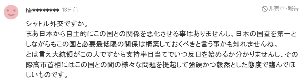“穿梭外交?日本绝不会主动恶化与该国(指韩国)的关系,虽然日本的国家利益应该放在首位,但或许我们应该只与该国建立最低限度的必要关系。话虽如此,面对这样的总统(指李在明),我们不知道他何时会为了提升支持率而开始反日,所以如果这种情况发生,我希望高市首相能够提出日韩之间存在的各种问题,并采取坚定果断的立场。”