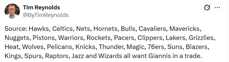 该记者推文具体为:“消息来源透露,老鹰、凯尔特人、篮网、黄蜂、公牛、骑士、独行侠、掘金、活塞、勇士、火箭、步行者、快船、湖人、灰熊、热火、森林狼、鹈鹕、尼克斯、雷霆、魔术、76人、太阳、开拓者、国王、马刺、猛龙、爵士和奇才都想通过交易得到扬尼斯。”