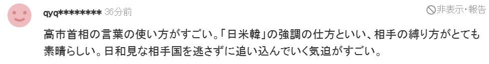 “高市首相的措辞令人叹服。她强调“日本、美国和韩国”的方式,以及她对对方的制衡,都堪称精妙。她不让一个投机取巧的国家溜走的决心令人钦佩。”