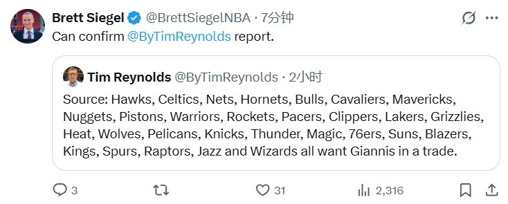 该记者推文具体为:“消息来源透露,老鹰、凯尔特人、篮网、黄蜂、公牛、骑士、独行侠、掘金、活塞、勇士、火箭、步行者、快船、湖人、灰熊、热火、森林狼、鹈鹕、尼克斯、雷霆、魔术、76人、太阳、开拓者、国王、马刺、猛龙、爵士和奇才都想通过交易得到扬尼斯。”